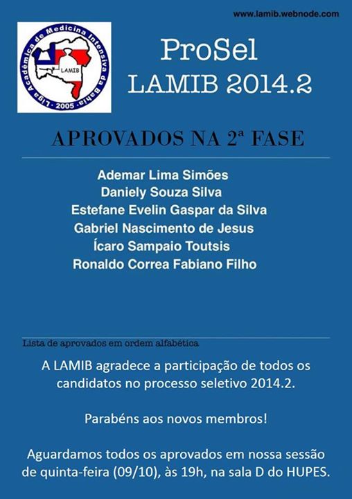 A LAMIB tem a grande satisfação em divulgar a lista de aprovador no Processo Seletivo 2015.2. Ficamos impressionados com o alto nível que todos os candidatos apresentaram na 2ª fase. Reforçamos a todos para continuarem acompanhando nossas sessões semanais às quintas-feiras. Segue a lista dos aprovados em ordem alfabética: